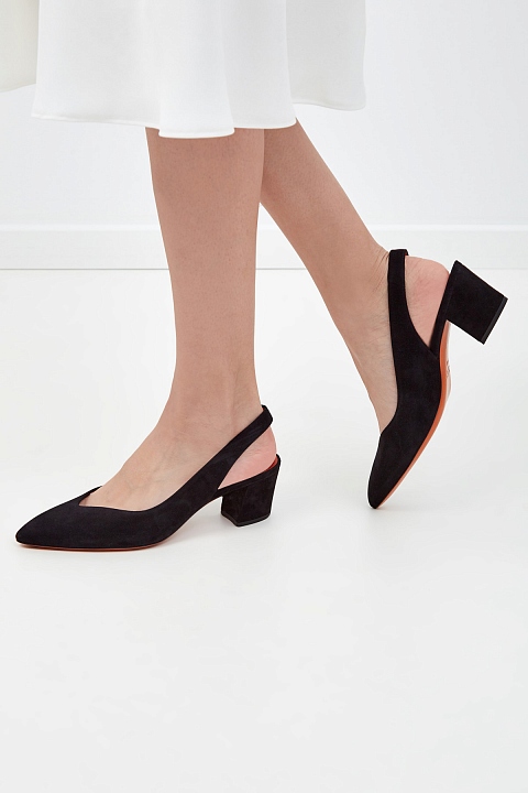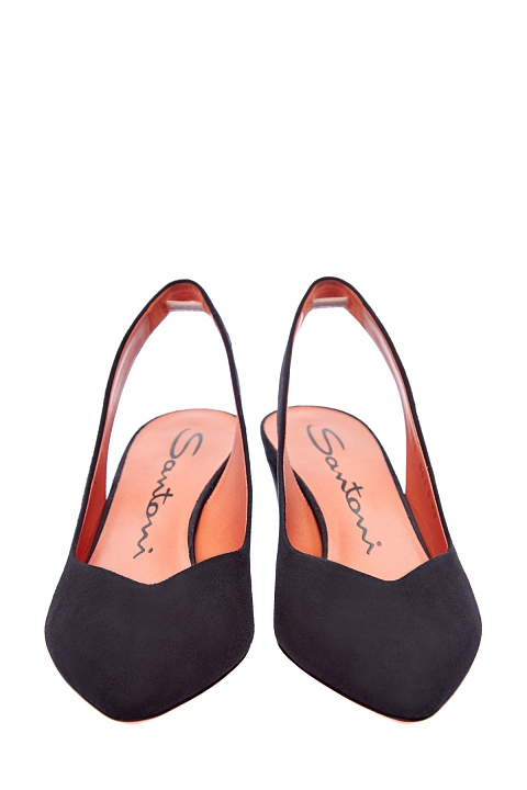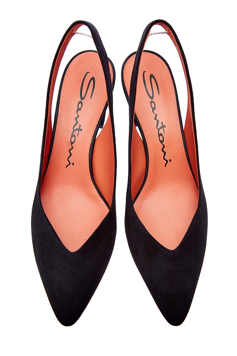 Классические туфли-лодочки от Santoni созданы в черном цвете из матовой бархатистой замши. Заостренный мысок создает элегантный образ, а фиксирующая лента с эластичной вставкой обеспечивают максимально комфортную посадку. Детали: кожаная стелька, устойчивый каблук, подошва из кожи с противоскользящей отделкой. Сделано в Италии.