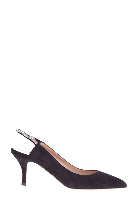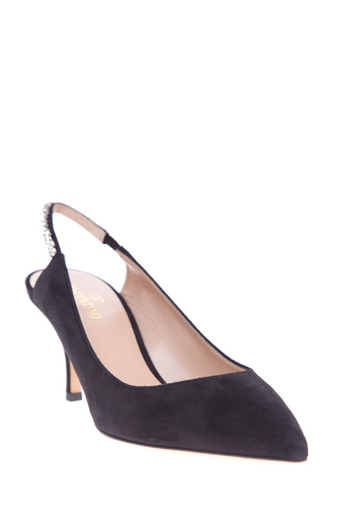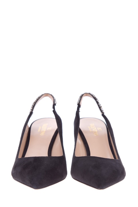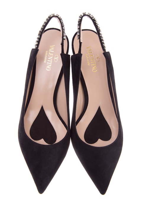 Стильные туфли от Valentino Garavani созданы из замши с бархатистой поверхностью черного тона. Модель с заостренным мыском дополнена фиксирующей лентой с декором крупными кристаллами и эластичными вставками по бокам. Внутренняя поверхность с отделкой из кожи шевро телесного оттенка декорирована замшевой вставкой в форме сердца. Высота каблука 7.5 см. Сделано в Италии.