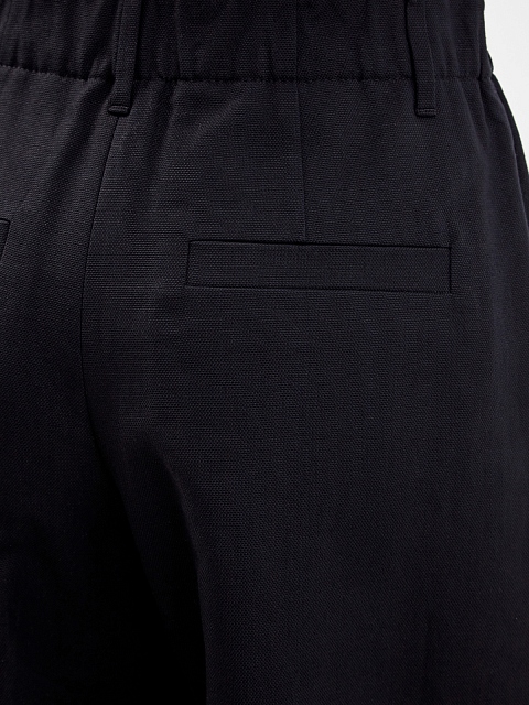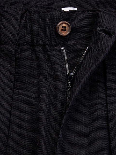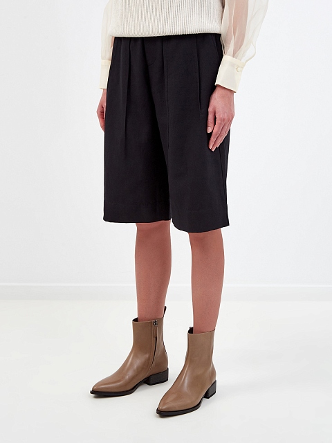 Широкие бермуды Long от Brunello Cucinelli созданы из легкой саржи на основе хлопка и льна. Модель в универсальном черном цвете дополнена заложенными складками от линии талии. Комфортный эластичный пояс с застежкой на молнию и роговую пуговицу обеспечивает посадку по фигуре. Детали: прорезные карманы, простроченные швы. Сделано в Италии.