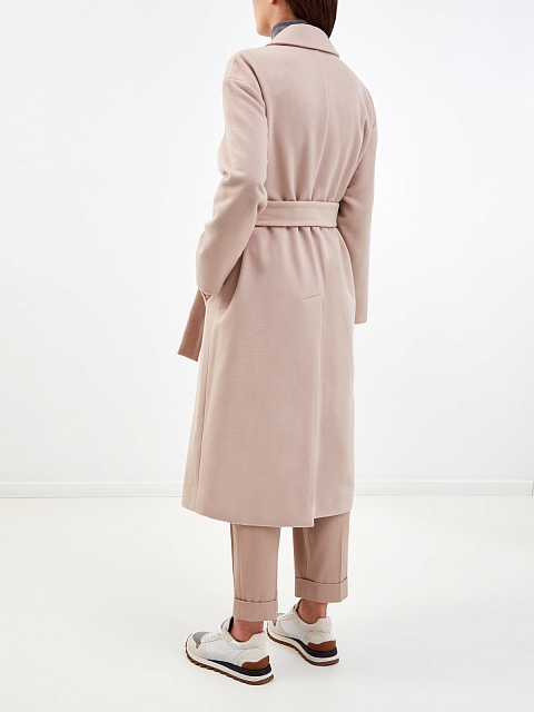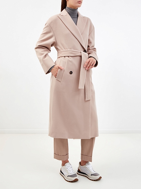 Двубортное пальто ручной работы от Brunello Cucinelli создано из шерсти и благородных волокон кашемира — особая техника прядения образует теплый материал с мягкой фактурой ворса. Модель в пудровом оттенке с лацканами и двубортной застежкой на роговые пуговицы. Прорезные карманы выполнены в традициях неаполитанской портновской школы. Детали: вышивка Мониль на спинке под воротом, спущенная линия плеч, полуподкладка. Сделано в Италии.