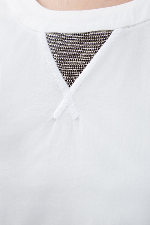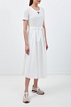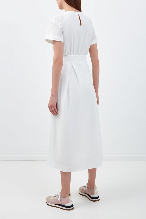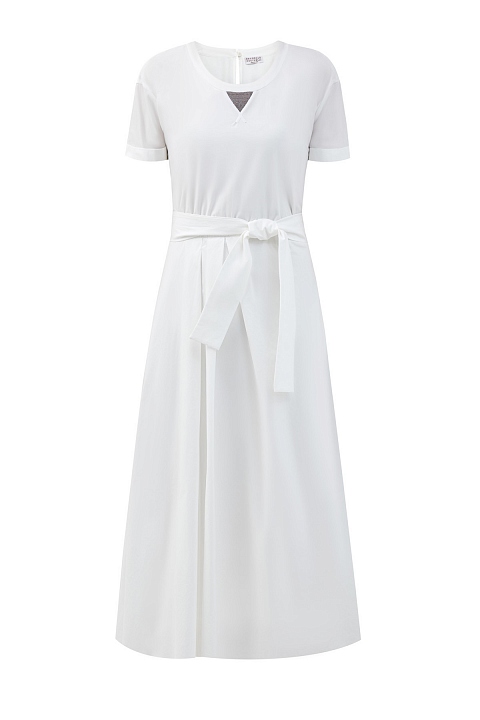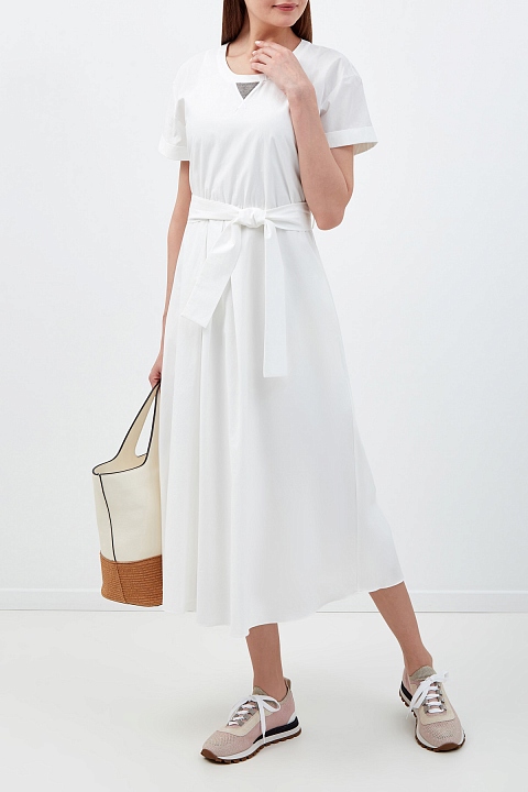 Платье-миди от Brunello Cucinelli создано из хлопкового поплина — плотной держащей форму ткани. Вышивка на вороте, заимствованная у свитшота, и рукава на спущенной линии плеч придают изделию нотку спортивного стиля. Съемный пояс создает приталенный силуэт. Детали: подол с заложенными складками, два кармана по бокам, застежка на пуговицу на спинке, подкладка. Сделано в Италии.