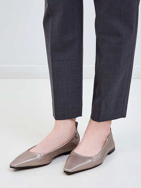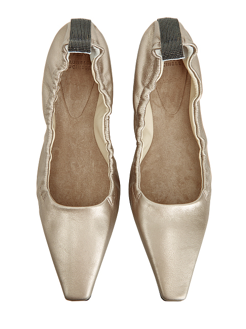 Ценные материалы и женственные детали определяют стиль балеток на плоской подошве от Brunello Cucinelli. Зауженный силуэт модели украшен особой текстурой телячьей кожи, характеризующейся благородным металлизированным эффектом. Полоска на задней части, вышитая нитями блестящей цепочки Мониль, завершает туфли легендарным украшением коллекций Brunello Cucinelli.