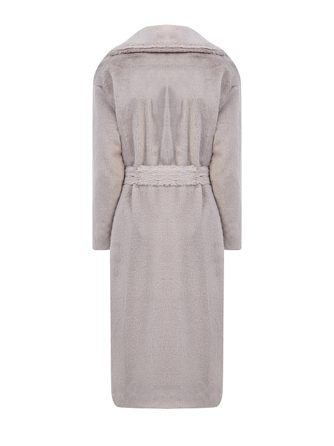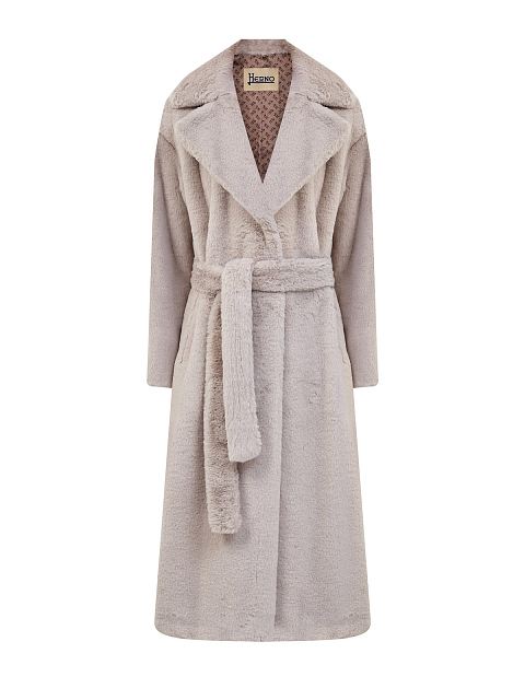 Пальто из эко-меха с атласной подкладкой и поясом в тон