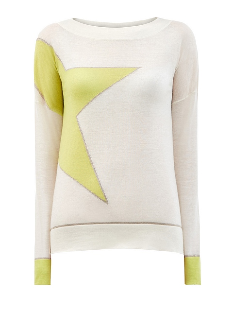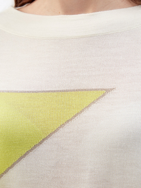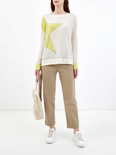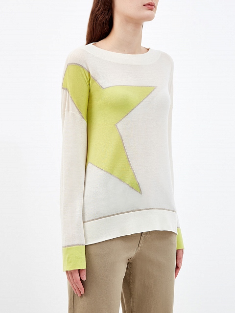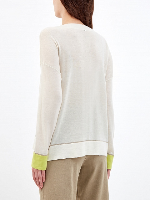 Джемпер из кашемира от Lorena Antoniazzi. Тонкая пряжа раскрывает свойства натуральных волокон и подчеркивает струящийся oversize-силуэт. Фирменный штрих — контрастный макро-логотип в технике интарсии, который выделен нитью мерцающего люрекса. Детали: круглый вырез, рукава на спущенной линии плеч, символика Модного дома из перламутра на спинке. Сделано в Италии.