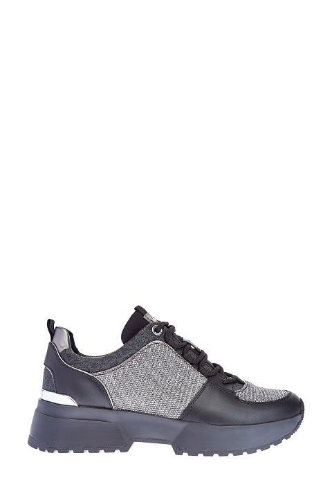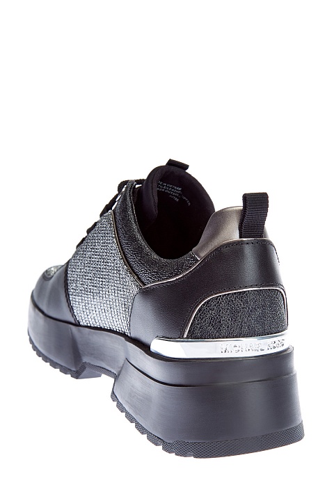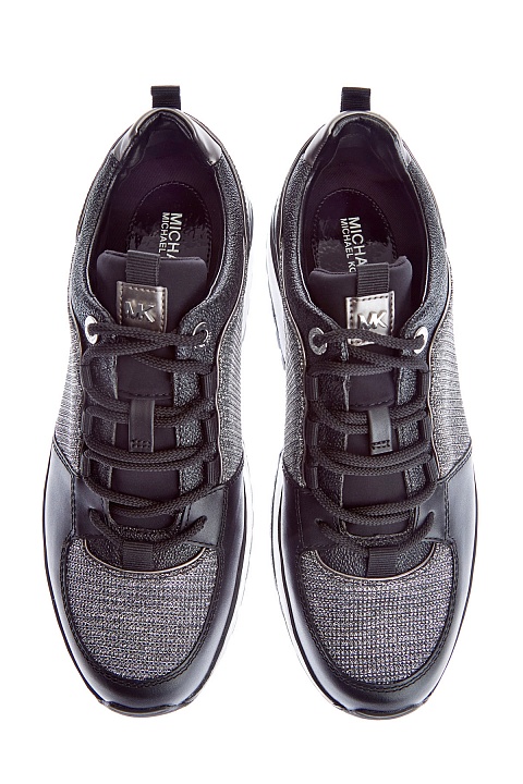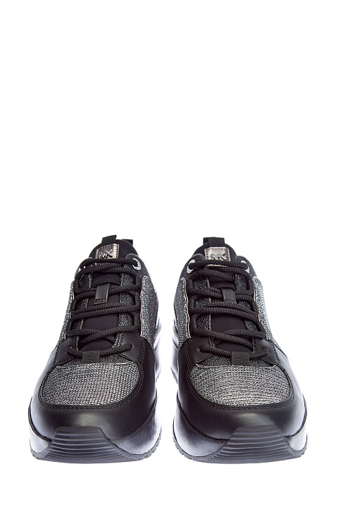 Мерцающие кроссовки от MICHAEL Michael Kors сочетают элементы из кожи, замши и мерцающей мембраны с люрексом. Модель выполнена в черном цвете и дополнена вставками с фактурным тиснением. Сегментированная платформа из амортизирующего вспененного каучука обеспечивает комфорт в движении. Треккерская шнуровка завершает дизайн.