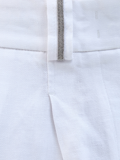 Свободные брюки-карго из натурального льняного габардина от Peserico сочетают в себе практичность и элегантность. Модель в базовом белом цвете с фактурными защипами идеально сочетается как со спортивной обувью, так и с женственными босоножками на каблуке. Шлевка с ювелирной цепочкой Punto Luce придает изделию мерцающий штрих.