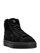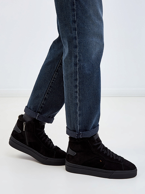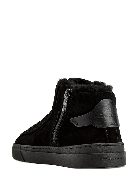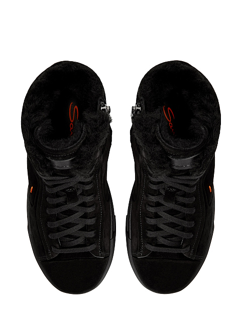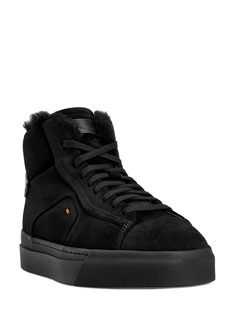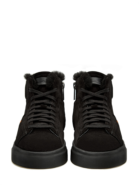 Высокие женские кеды от Santoni созданы вручную из мягкой бархатистой замши в универсальном черном цвете. Подкладка из густой овчины обеспечивает максимальный комфорт в холодное время года. Модель оснащена амортизирующей литой подошвой и боковой застежкой на молнию с брендированным пуллером. Фирменный стиль подчеркивают кожаные вставки с тиснением и узнаваемый оранжевый стежок. Сделано в Италии.