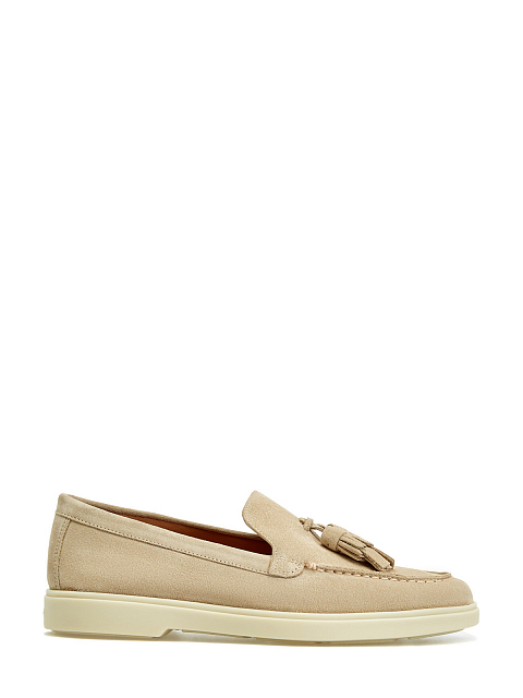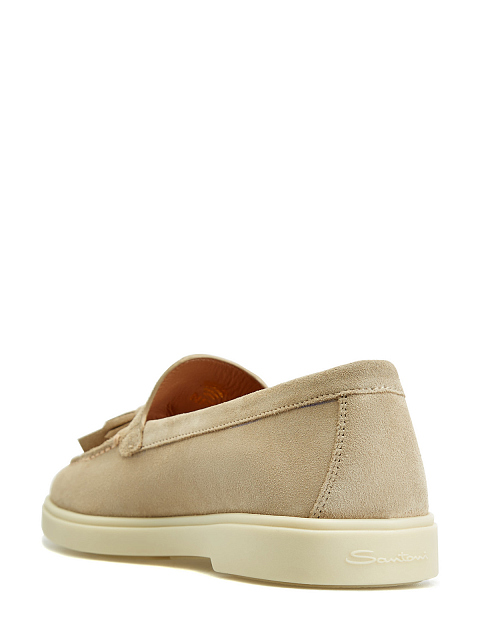 Лаконичные лоферы от Santoni представлены в базовом бежевом оттенке. Для создания модели была выбрана фактурная замша с бархатистой поверхностью, объемные кисти и фактурная отделка контуров вносят в образ нотку стиля бохо. Детали: внутренняя поверхность из кожи, подошва с противоскользящими вставками, небольшой анатомический каблук. Сделано в Италии.