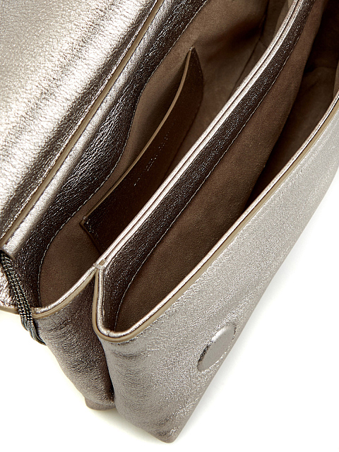Элегантный клатч из телячьей кожи ламе от Brunello Cucinelli характеризуется изящным и современным силуэтом. Мягкость кожи в сочетании с ее металлизированным видом придает аксессуару особенный акцент. Плечевой ремешок из цепочки Мониль добавляет сумке еще одну сверкающую ноту, а подкладка из замшевой кожи и застежка на магнит завершают сумку практичными и функциональными деталями. Сделано в Италии.