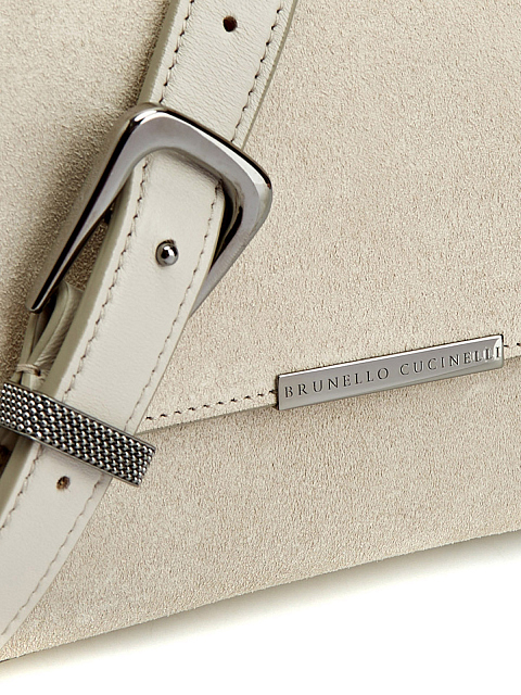 В сумке-мессенджере BC Duo от Brunello Cucinelli изысканный и женственный внешний вид сочетается с ценными материалами и сверкающими деталями. Бархатистая замша подчеркивает прямоугольный силуэт, который напоминает классический конверт. Блестящая цепочка Мониль украшает аксессуар изящным сиянием. Детали: регулируемый ремень, литая деталь на передней планке, внутренняя поверхностью из гладкой кожи.
