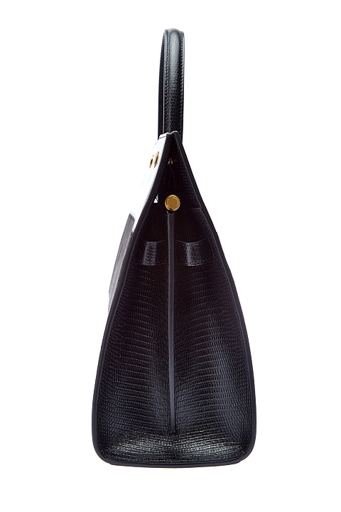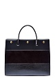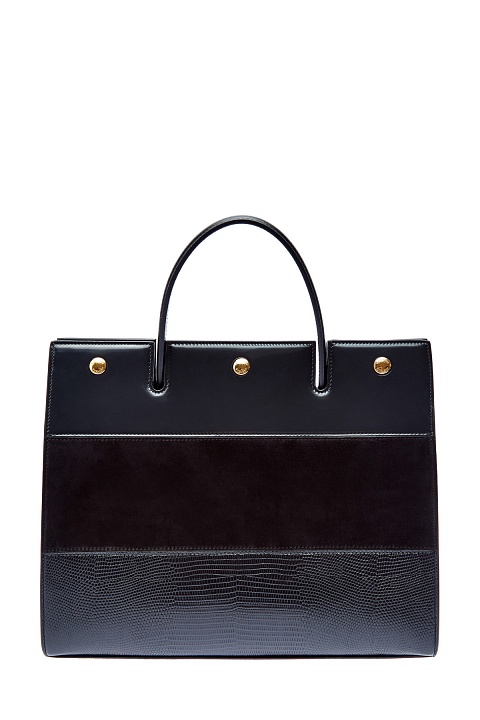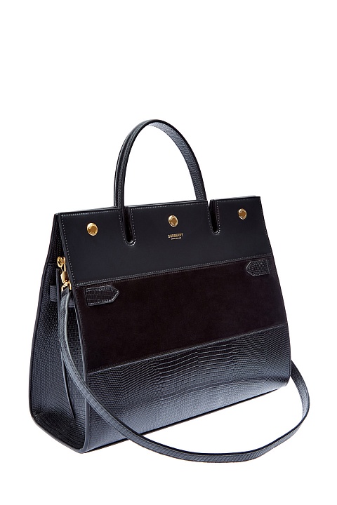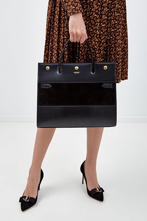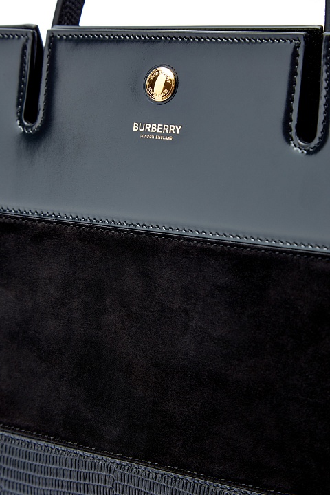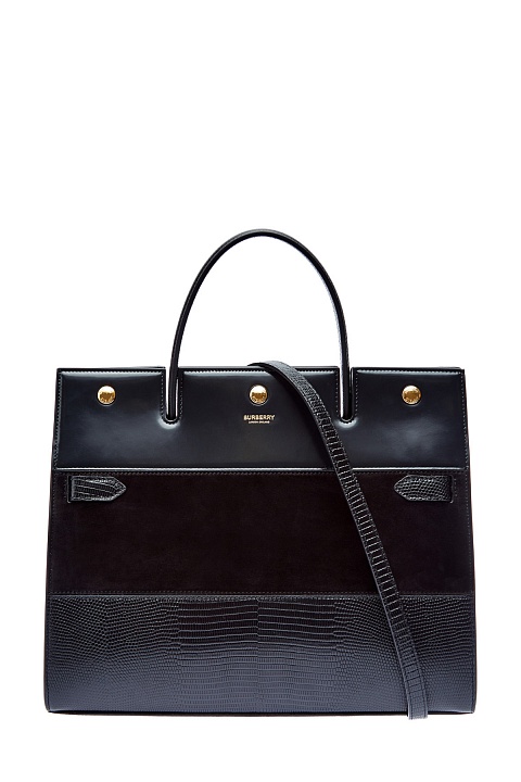 Структурированный тоут Title от Burberry выполнен из кожи оленя. Монохромное исполнение подчеркивает контрастные по фактуре вставки из бархатистой замши и тиснение с эффектом кожи рептилии. Аксессуар с одной ручкой и съемным плечевым ремнем. Внутри: два отделения на подкладке и один разделительный карман с молнией. Детали: фурнитура с глянцевым золотистым напылением, тисненый логотип бренда, застежка на кнопки.