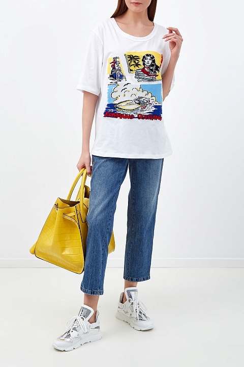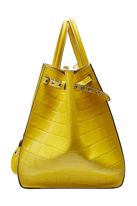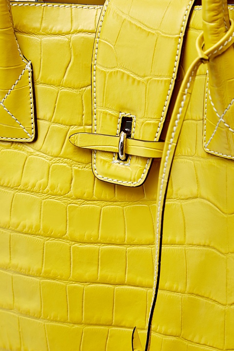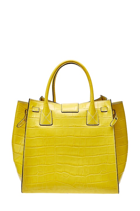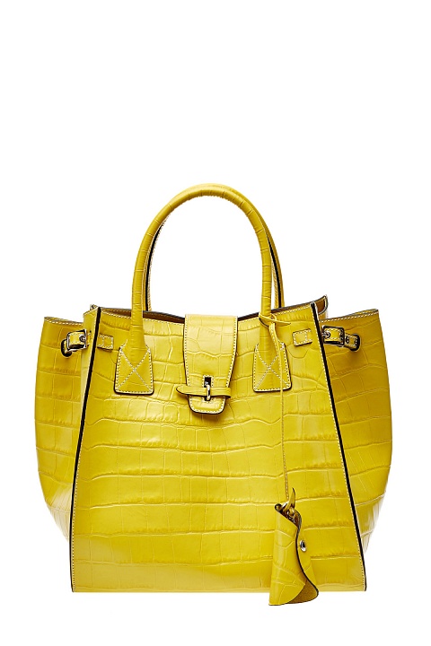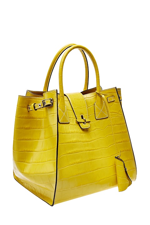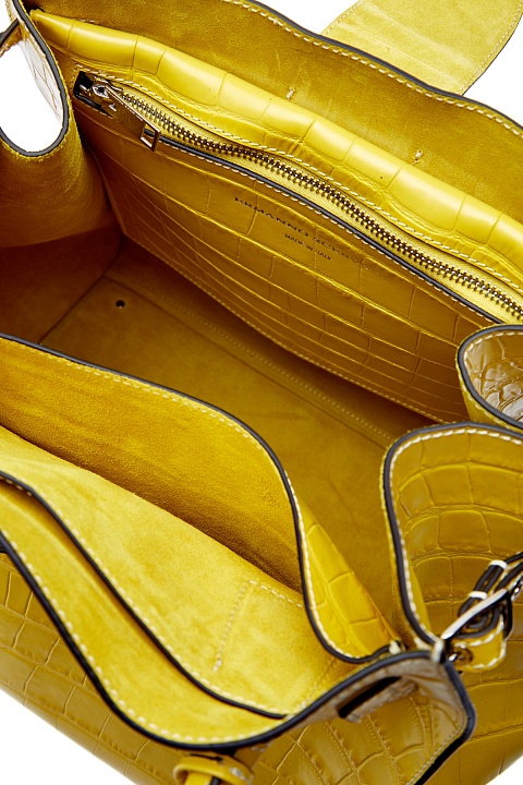 Большая сумка-шоппер от Ermanno Scervino выполнена из глянцевой воловьей кожи с тиснением под кожу аллигатора. Тщательно подобранный материал и контрастная прострочка швов подчеркивают архитектурные линии аксессуара. Завершающие штрихи — подвеска-брелок в кожаном чехле и тонкие ремешки по бокам — делают аксессуар универсальным дополнением для повседневных и деловых образов. Внутри: замшевая отделка, большие накладные карманы. Сделано в Италии.