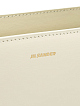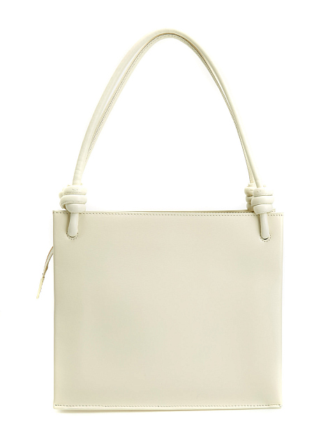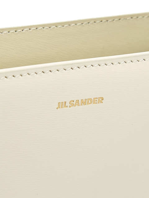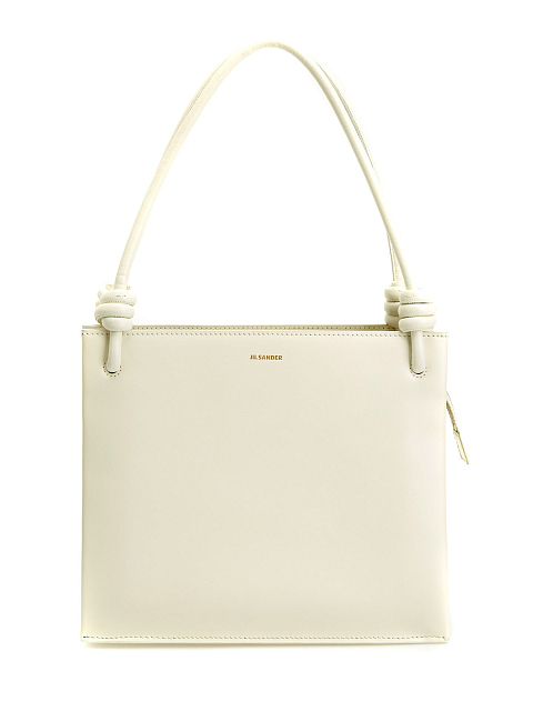 Лаконичная женская сумка Giro размера мини от Jil Sander. Модель кремового оттенка выполнена из гладкой полированной телячьей кожи, поверхность аксессуара декорирована культовым логотипом с золотистым напылением. Неформальный акцент — объемные узлы на двойных ручках. Внутренняя отделка из кожи наппа и застежка на молнию завершают минималистичный дизайн.