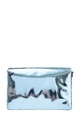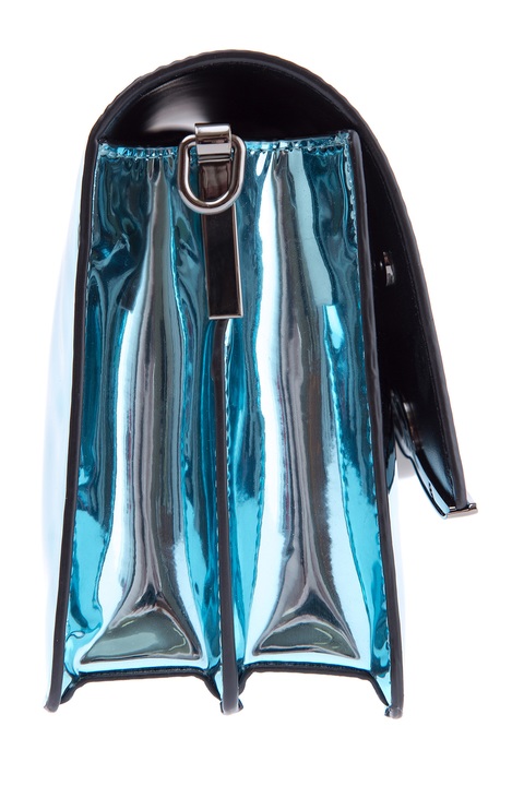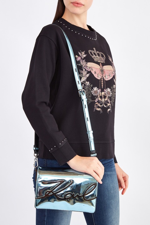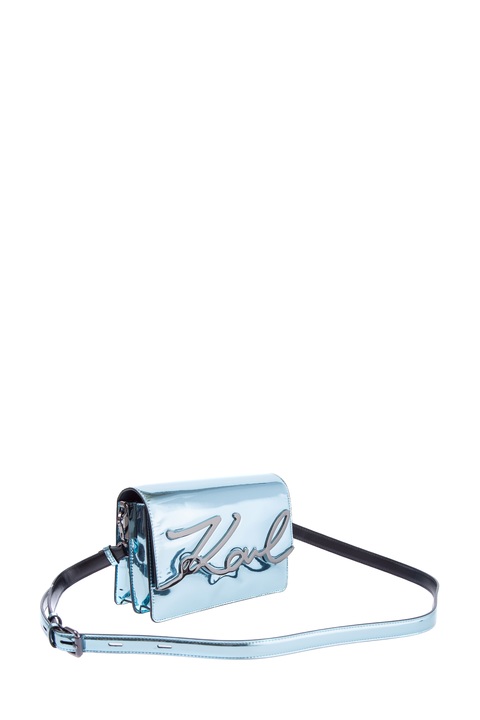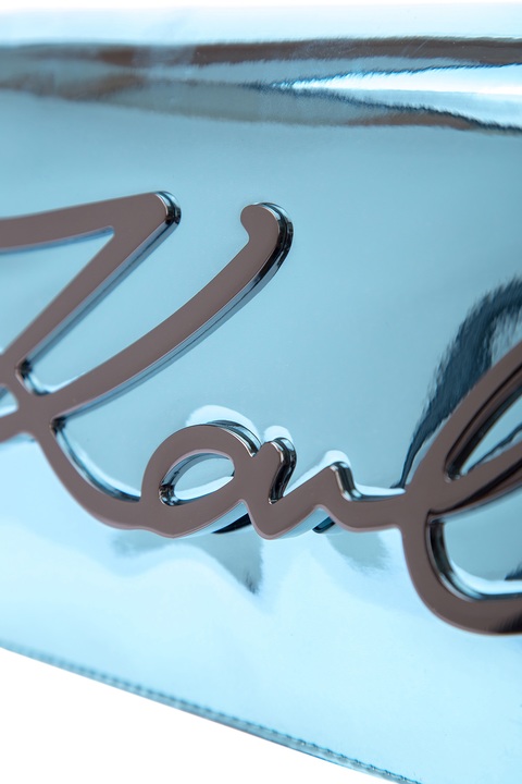 Миниатюрная женская сумка «Signature» из весенне-летней коллекции бренда Karl Lagerfeld создана в металлическом оттенке «Clear Sea» с гладкой зеркальной поверхностью. Аксессуар оснащен съемным плечевым ремнем и внутренней отделкой из телячьей кожи. Перекидной клапан изделия декорирован подписью дизайнера, выполненной в металле серебристого тона. Внутри имеется два основных отделения. Параметры: ширина 23 см, высота 15 см, глубина 9 см.