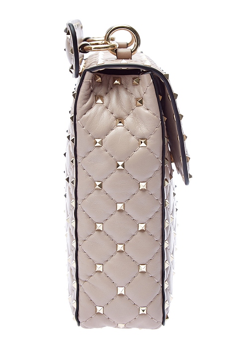 Оригинальная вертикальная сумка Rockstud Spike от Valentino Garavani выполнена из мягкой кожи наппа в пудрово-розовом цвете. Изделие в стиле панк декорировано фирменными шипами-пирамидами и дополнено поворотным механизмом застежки. Внутри имеется общее отделение с прорезным карманом на молнии. Модель оснащена эргономичной ручкой и ремнем-цепочкой. Сделано в Италии.